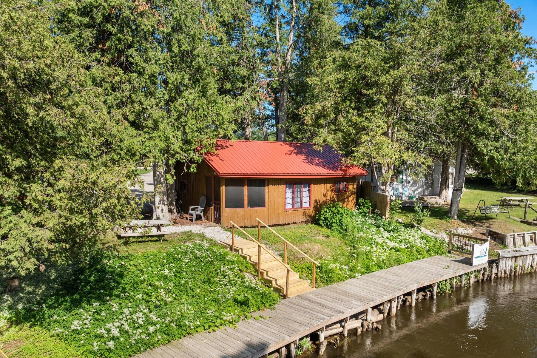 Cabin 1 offers a blend of comfort and functionality to enhance your stay. It features a full kitchenette, perfect for preparing your favorite meals. The cozy living area includes an EZ Lounger sofa that converts into a full-sized bed, providing comfortable sleeping arrangements for extra guests. Relax on the screened-in front porch, furnished with two chairs and a table, where you can enjoy your morning coffee or unwind in the evening. The cabin also boasts stunning views of the Sturgeon River, making your stay both peaceful and picturesque.